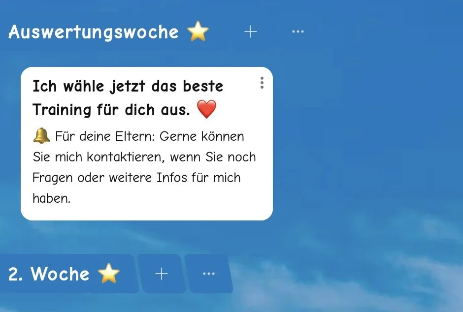 Nach etwa drei Wochen wird das Training individuell angepasst: Inhalte werden erweitert und Grundlagen gefestigt. Bei Bedarf wird das Training weiter angepasst.